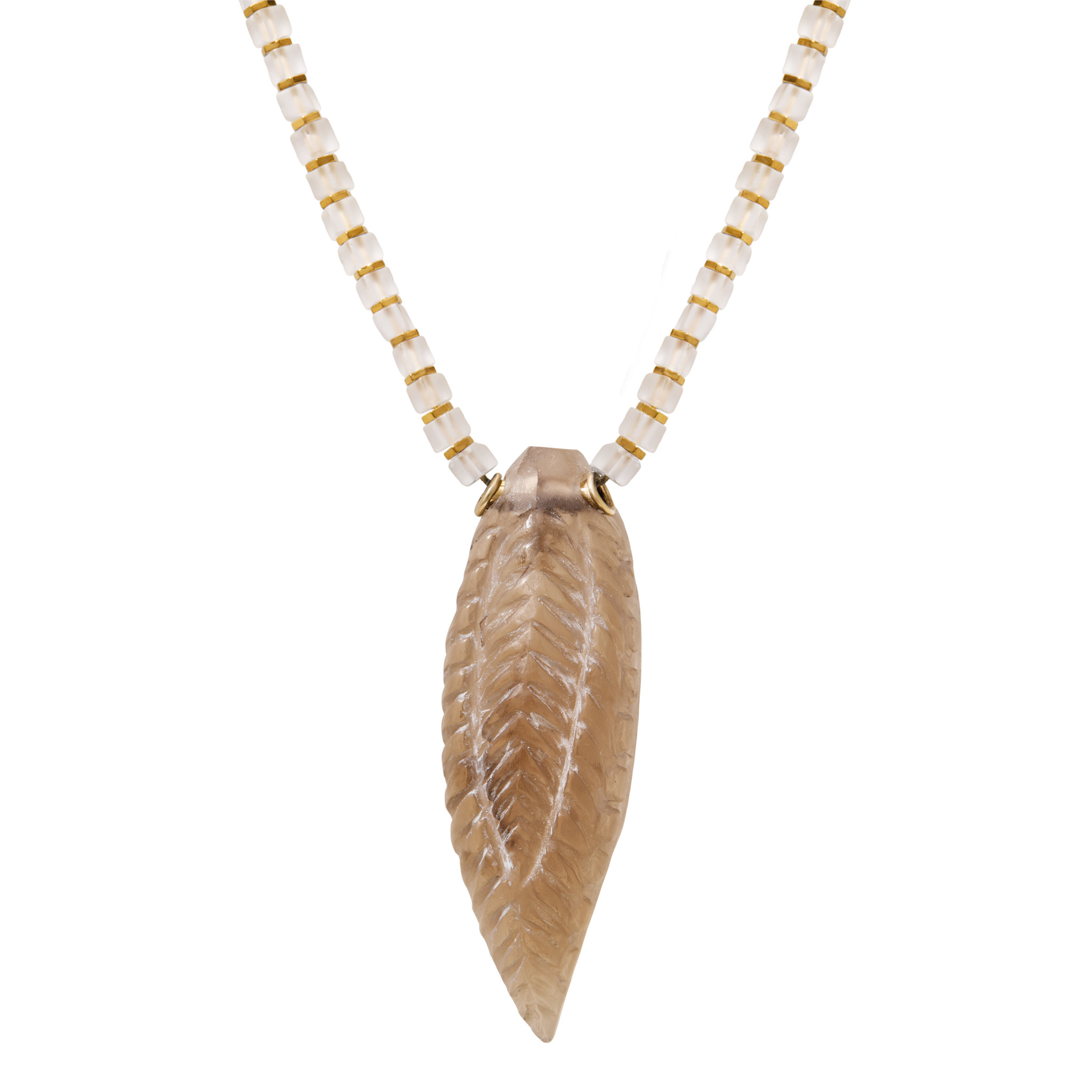 Χειροποίητο μενταγιόν σε Χρυσό 14K με σκαλισμένο στο χέρι φύλλο σε φυσικό Smoky Quartz. Συνοδεύεται από Kολιέ με φυσικούς Frost Αχάτες σε κοπή κύβου και εξάγωνους Αιματίτες.