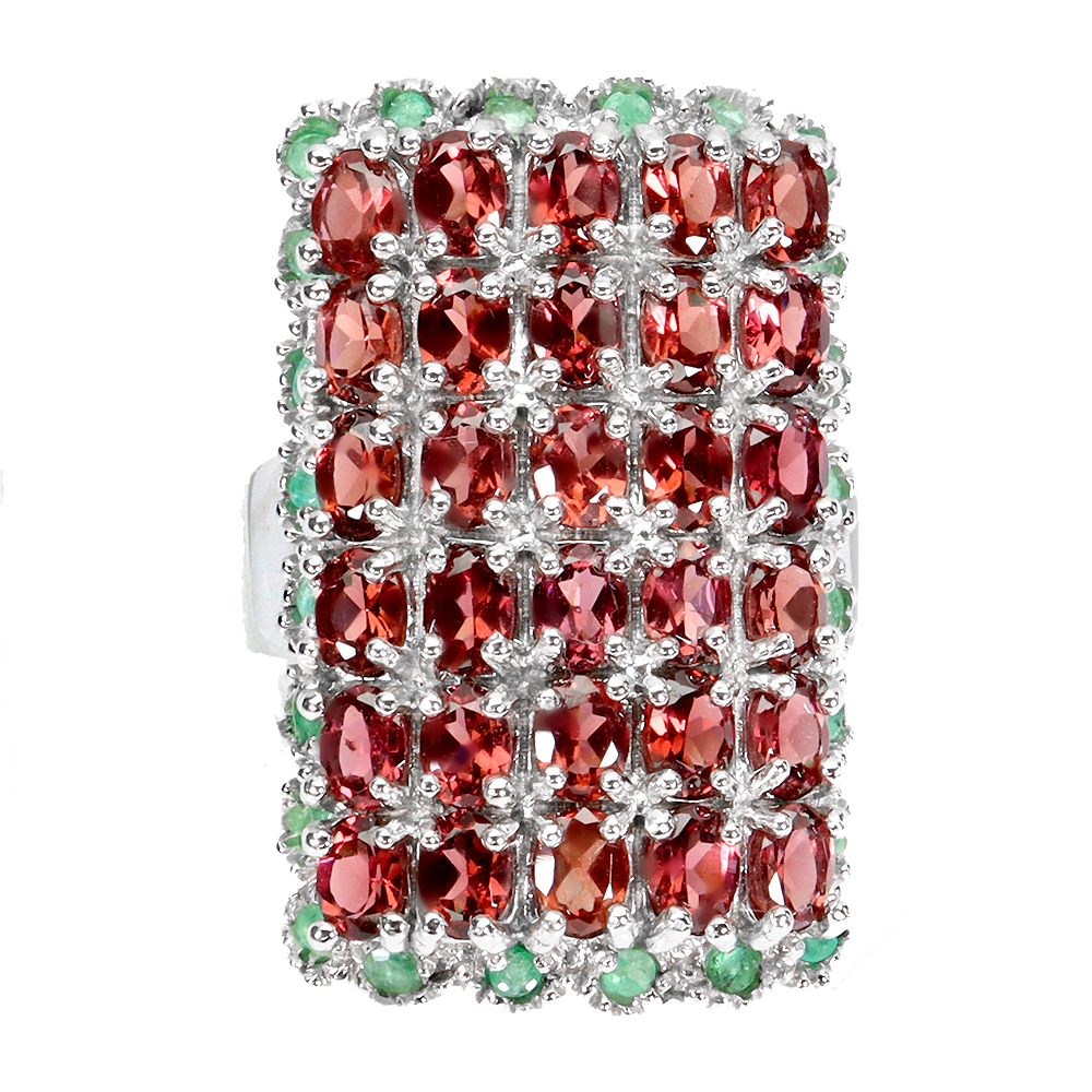 Δαχτυλίδι σε 14K λευκό επιχρυσωμένο Ασήμι 925 με Φυσικά Σμαράγδια & Γρανάτες Μοζαμβίκης.