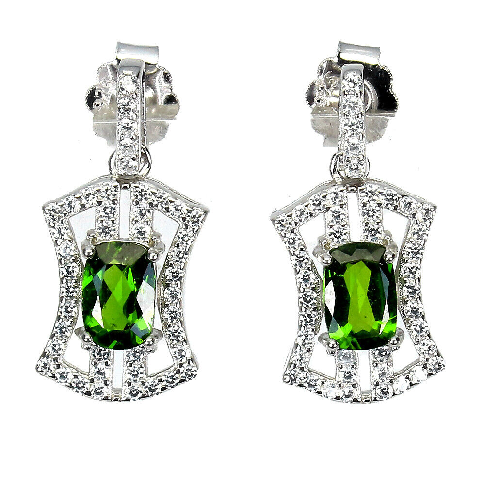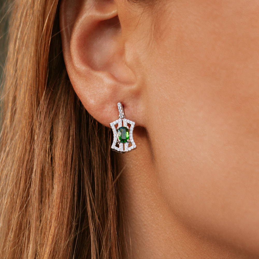 Earrings in 14K White Gold Plated 925 Sterling Silver with Natural Chrome Diopsides and CZ Zircon.